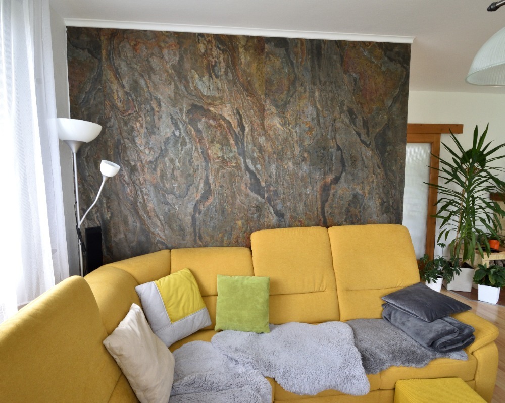Použili jsme to na obklad dvou stěn v obývacím pokoji, a protože se nám ta realizace líbila a zadařila, pokračovali jsme výrobou obrazu z kamenné fólie a v kuchyňské lince jsme obnovili záda mezi skřínkami.